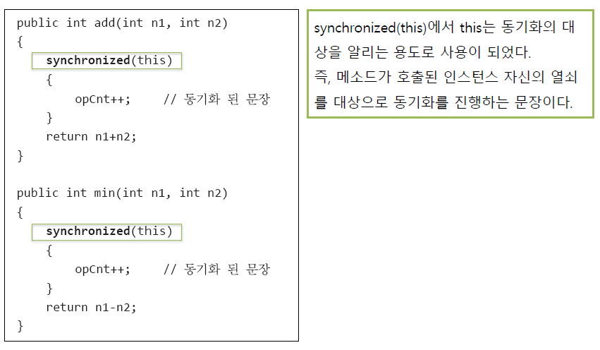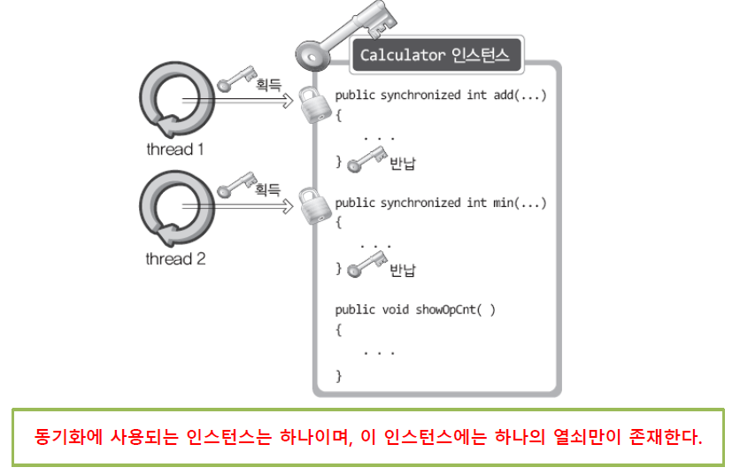 - 한 번에 하나의 쓰레드만 객체에 접근할 수 있도록 객체에 락(lock)을 걸어서 데이터의 일관성을 유지하는 것.