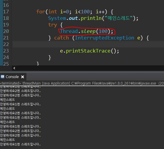 main스레드에 Thread.sleep(100)을 똑같이 넣어주면 셋이 번갈아서 실행됨
