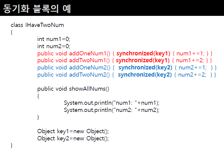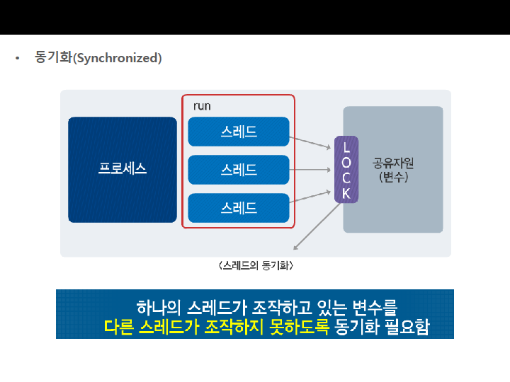 • 언어적 차원 : 스레드의 동기화 지원 가능