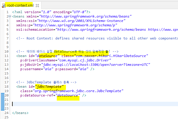 데이터 베이스 / JdbcTemplate 클래스 빈 등록 / root-context.xml