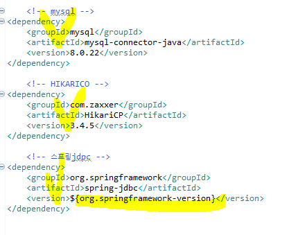 mysql / hikariCP / springjdbc라이브러리를 pom.xml에 등록