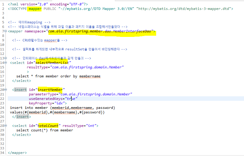 mapper에서는 인터페이스 안에 있는 메서드와 이름을 같에 만들어 주는 것이 중요하다.