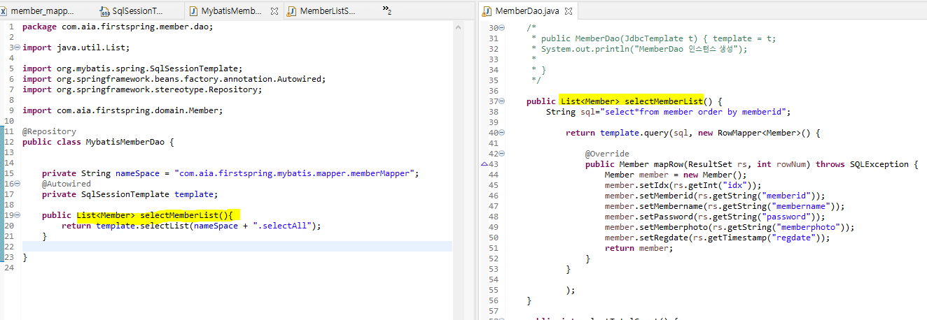 이전 코드와 비교했을때 Mybatis를 이용하면 코드가 매우간결해지는 것을 볼 수 있다.