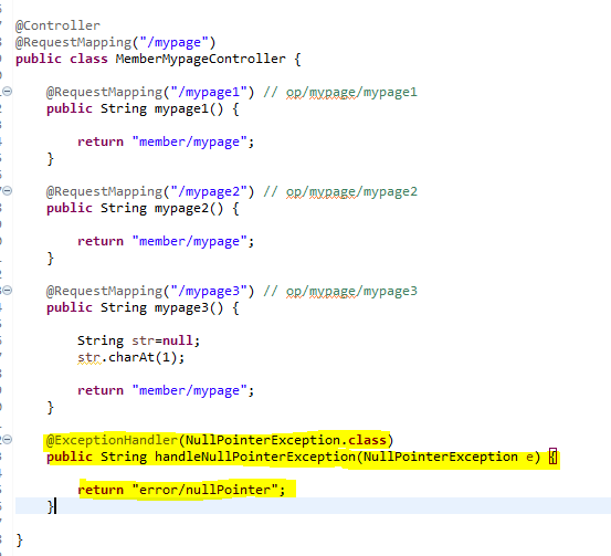 mypage3에서 강제로 예외를 발생시켜보았다. 에러가 발생시 error/nullpoiner.jsp로 이동한다.