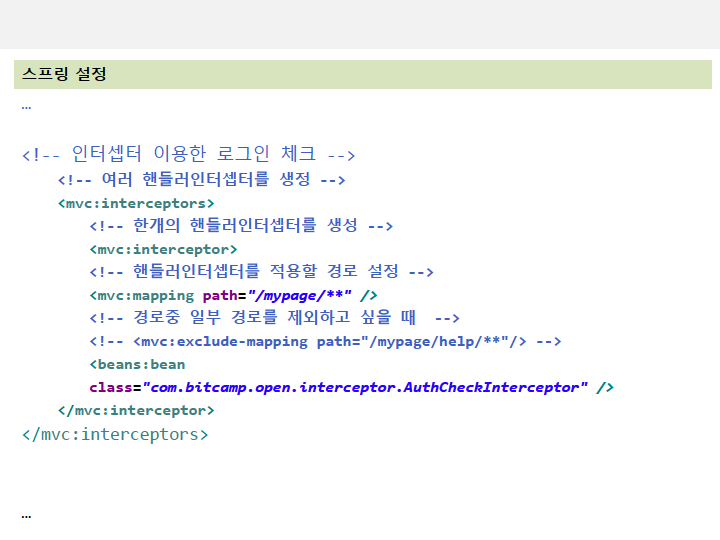 HandlerInterceptor를 구현 한 뒤에는 <mvc:interceptors> 의 interceptors 프로퍼티를 사용해