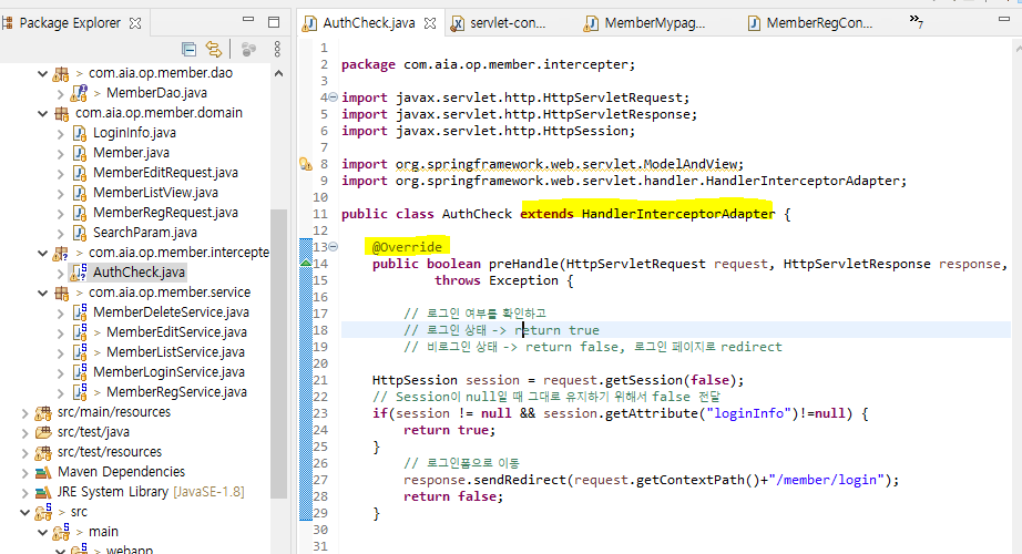 – 핸들러 인터셉터는 HandlerInterceptor 인터페이스를 구현해서 만든다. 이 인터페이스를 구현 할 경우 사용하지 않는 메서드도 구현 해주어야 한다.