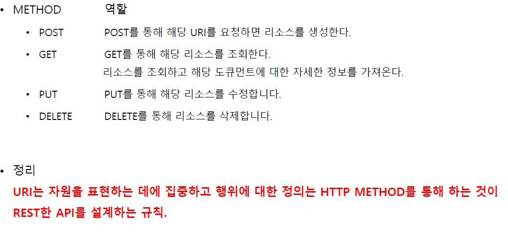 -REST는 Representational State Transfer의 약어로 하나의 URI는 하나의 고유한 리소스를 대표하도록 설계된다는 개념.