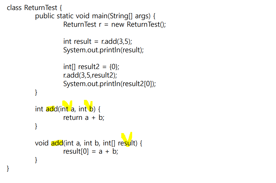 메소드의 매개변수 선언(개수 또는 자료형)이 다르면 메소드 오버로드가 성립한다.