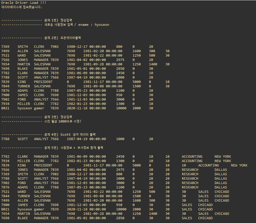 System.out.println("-------------------- 문제 5번) 사원정보 + 부서정보 함께 출력");